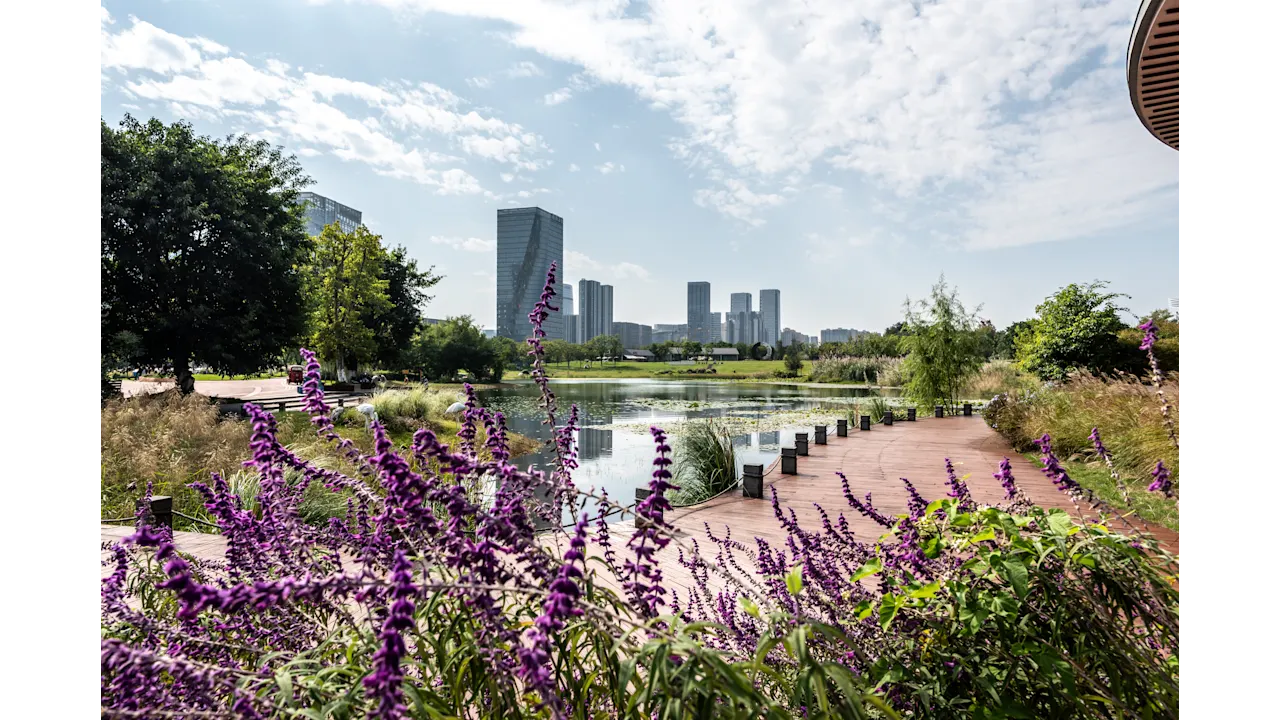 The park covers an area of 3,033 acres, 200 of which are covered by the main lake in the park – the Yinggui Lake. The park also features two more lakes, two museums, and the Tianfu Humanities and Art Library.